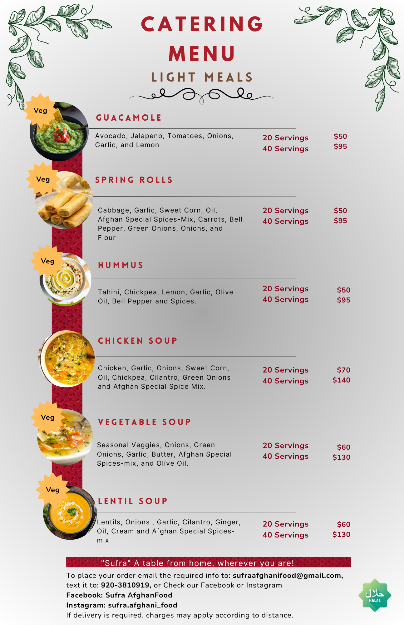 Dive into a world of taste adventures with our ever-evolving menu of catering. Every dish is a new story waiting to delight your taste buds. At Sufra, we specialize in full-service catering that brings the vibrant flavours of Afghan cuisine straight to your event. Whether you're planning an intimate gathering or a large celebration, we offer customized menus, flexible portions, and beautifully presented dishes made with love.